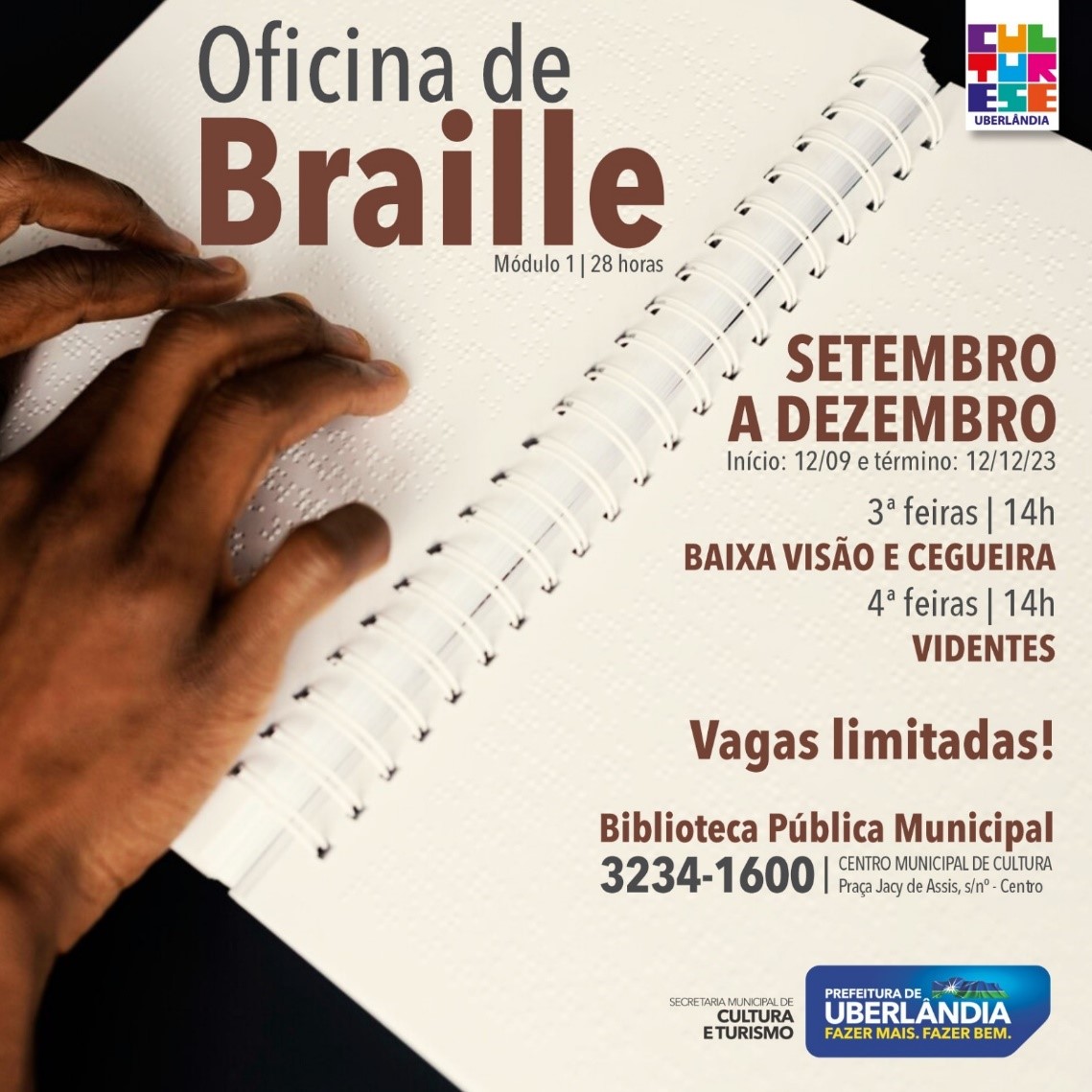 A Prefeitura de Uberlândia, por meio da Secretaria Municipal de Cultura e Turismo, está com inscrições abertas para mais uma edição da Oficina de Braille. A capacitação é gratuita e acontece durante o último trimestre do ano na Biblioteca Municipal Juscelino Kubitschek. As inscrições podem ser feitas tanto presencialmente no Centro Municipal de Cultura quanto pelo telefone (34) 3234-1600.