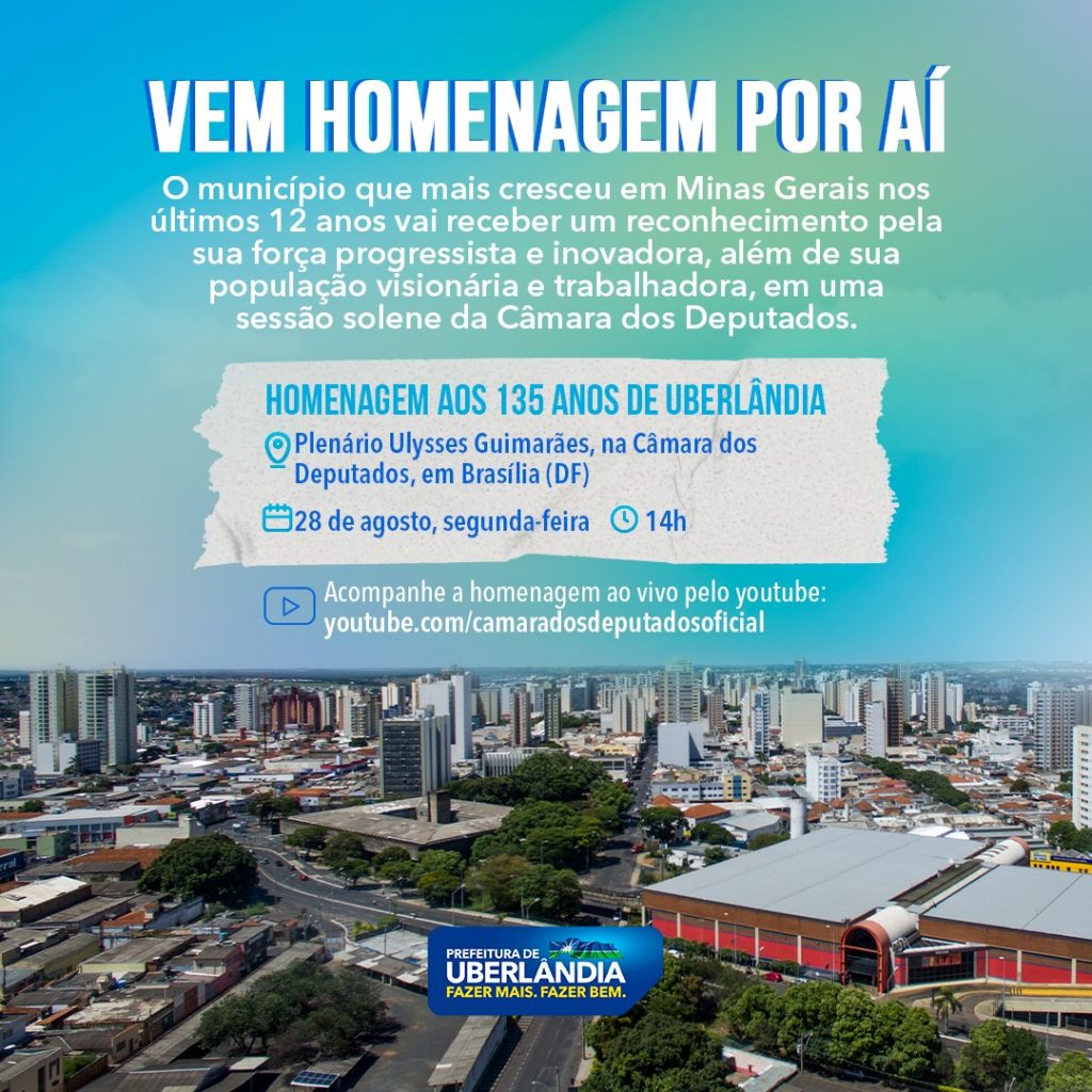 Como forma de reconhecimento à força progressista e inovadora de Uberlândia e à sua população visionária e trabalhadora, a Câmara dos Deputados realizará, às 14h desta segunda-feira (28), uma sessão solene pelos 135 anos da segunda maior cidade de Minas Gerais. O prefeito Odelmo Leão estará presente na homenagem, que acontecerá no Plenário Ulysses Guimarães, na Câmara dos Deputados, em Brasília (DF), e será transmitida pelo canal no Youtube da Casa Legislativa.